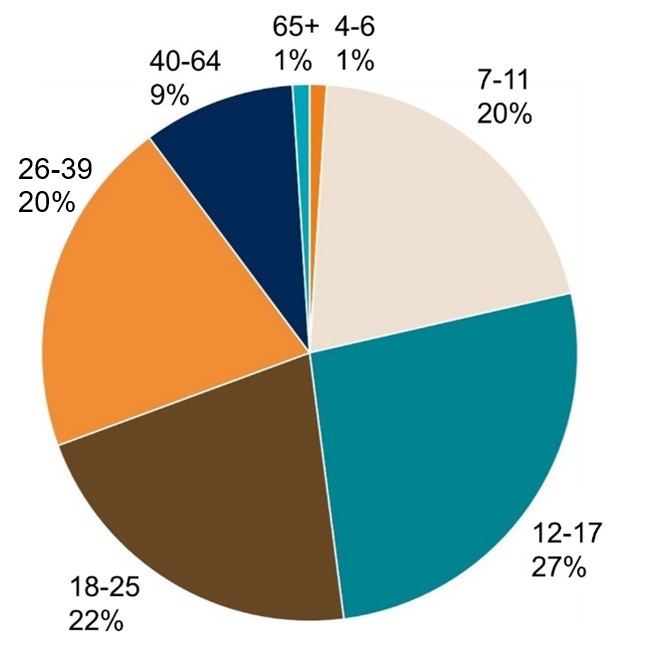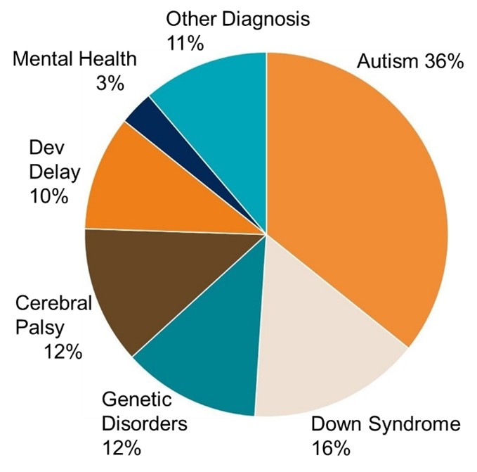 | | Autism and Genetic Disorders, such as Down Syndrome, are our largest categories of disabilities. We offer our services to most all ages. Riders must be at least 4 years old, but there is no upper age limit so long as there is a doctor’s approval and we have an appropriate horse available. As you can see, we have a good mix of age ranges. In closing, here are a few quotes from our participant families: - “My son continues to love going to RVR! He looks forward to Mondays and after he gets home from school, he will go sit on the bench by the door because his personal care attendant reminds him that it is horse night. He jumps up and down and claps his hands when he knows he is getting to ride. I really appreciate RVR and all the volunteers and staff. Everyone is kind and accepting and puts a smile on my son's face, which is not easy to do. It is typically the happiest I see him all week!”